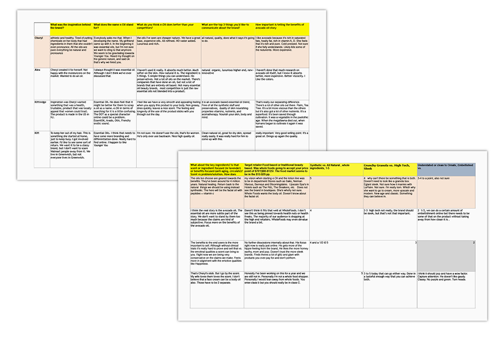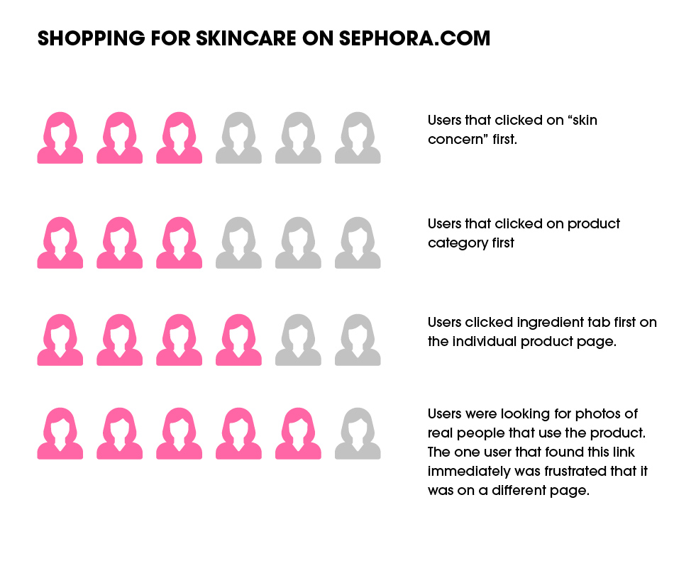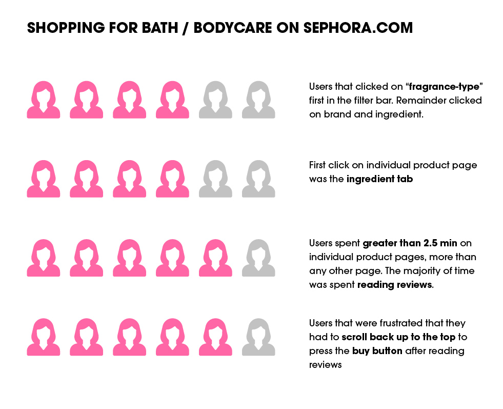 We had developed initial target customer profiles during the brand strategy phase, but these lacked the online behavioral data to design an effective digital experience. As the packaging design process was underway, we recruited six users that matched these profiles and completed in-person moderated tests to determine how these users find and purchase product online, as well as what attributes they value most. Since our product line straddled both the bath/bodycare and skincare categories, we had each user shop for a bodycare product and a skincare product on Sephora.com. Some highlights from these tests are shown below.