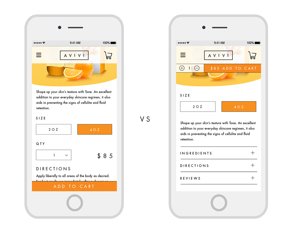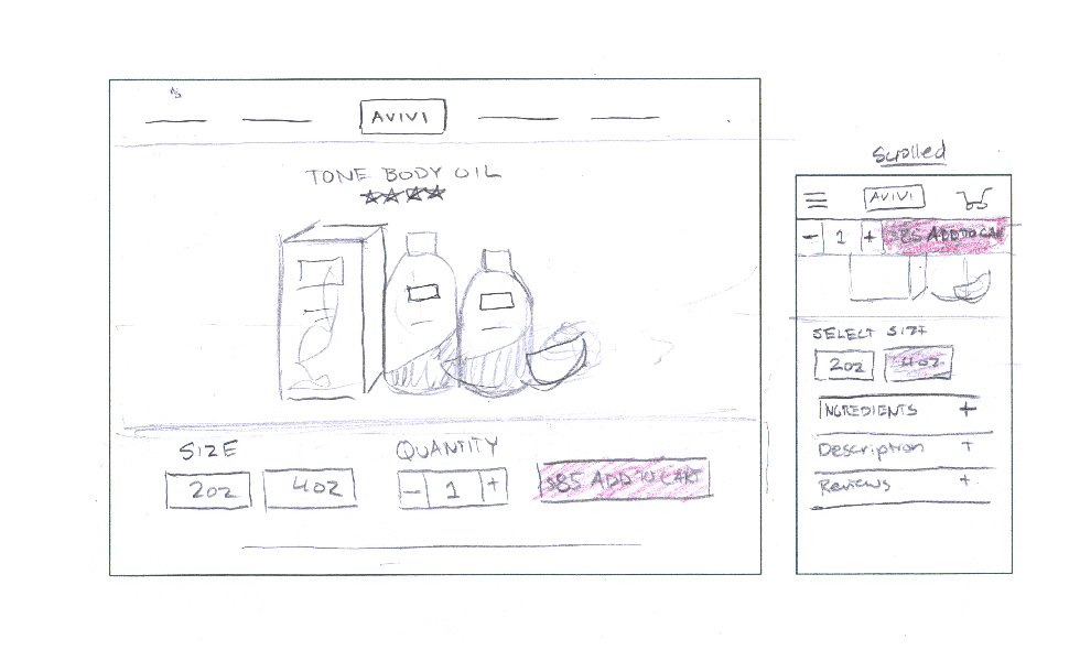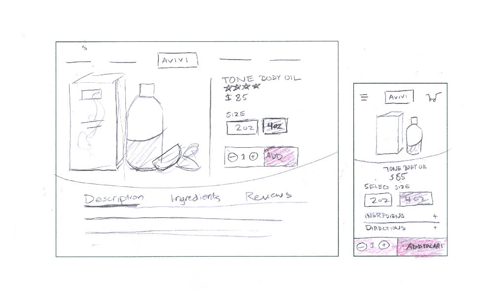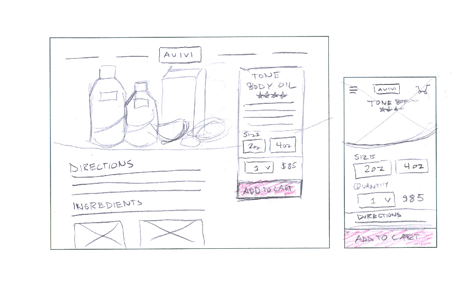 Since initial user tests revealed that the majority of the site visit was spent on the individual product page, I sketched several ways to approach the information and features on the page to make it as conversion-centric as possible. On mobile specifically, I looked at having the having the buy button on the top vs. the bottom. and whether quantity and price should be combined within one bar. I also experimented with placing information under tabs/drawers vs. exposing everything from the outset.