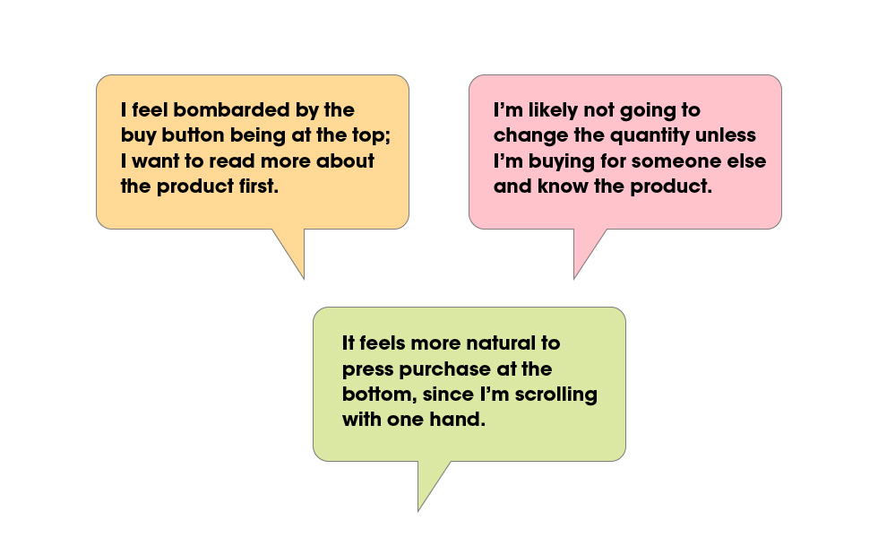 We tested the two prototypes; each had a different approach to the individual product page. The feedback made it clear that the buy-button should be at the bottom, and users preferred to scroll through the information rather than tap to open drawers. Quantity was also determined to not be that important, so I kept separated from the sticky buy button.