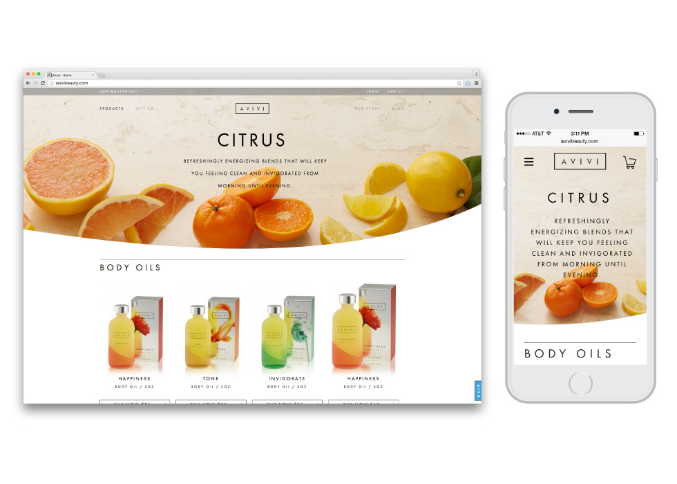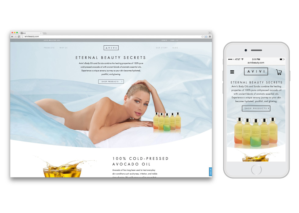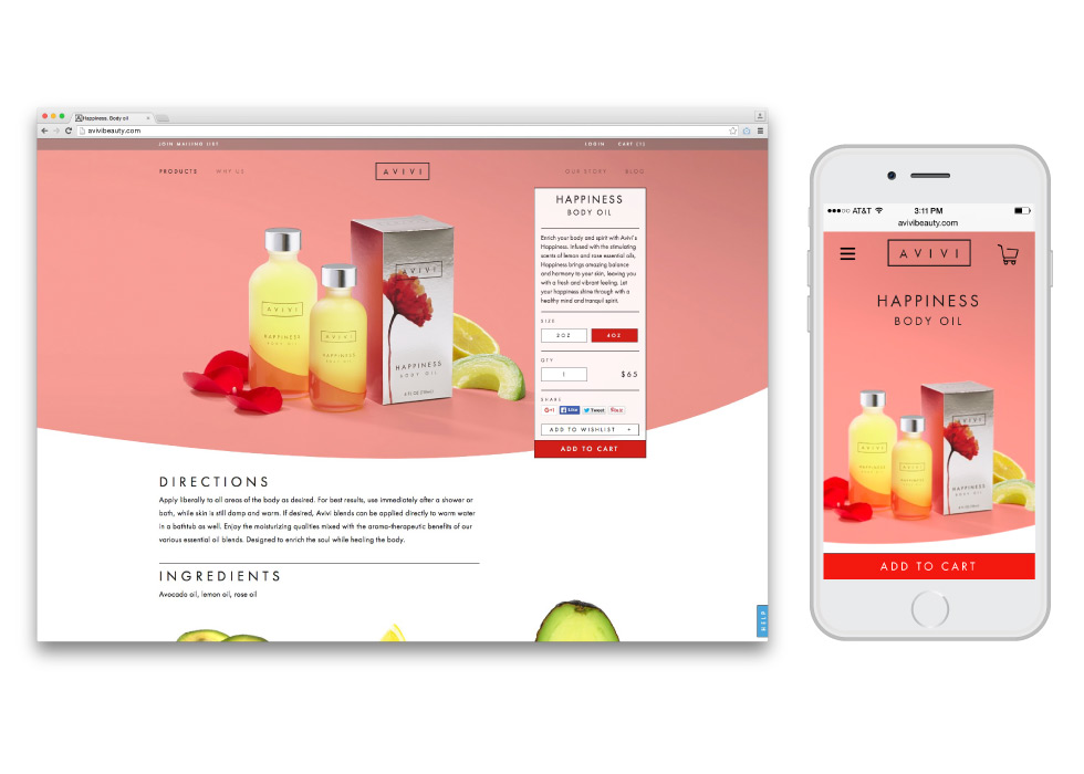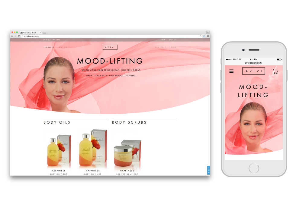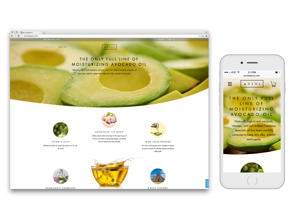 Avivi is a luxury skincare line comprised of body oils, scrubs and facial serums that blend avocado oil with essential oils. As their initial launch would be online only, they needed an e-commerce site and microsite to kickstart sales. With a unique packaging concept already in place, I led the creation of their digital presence.