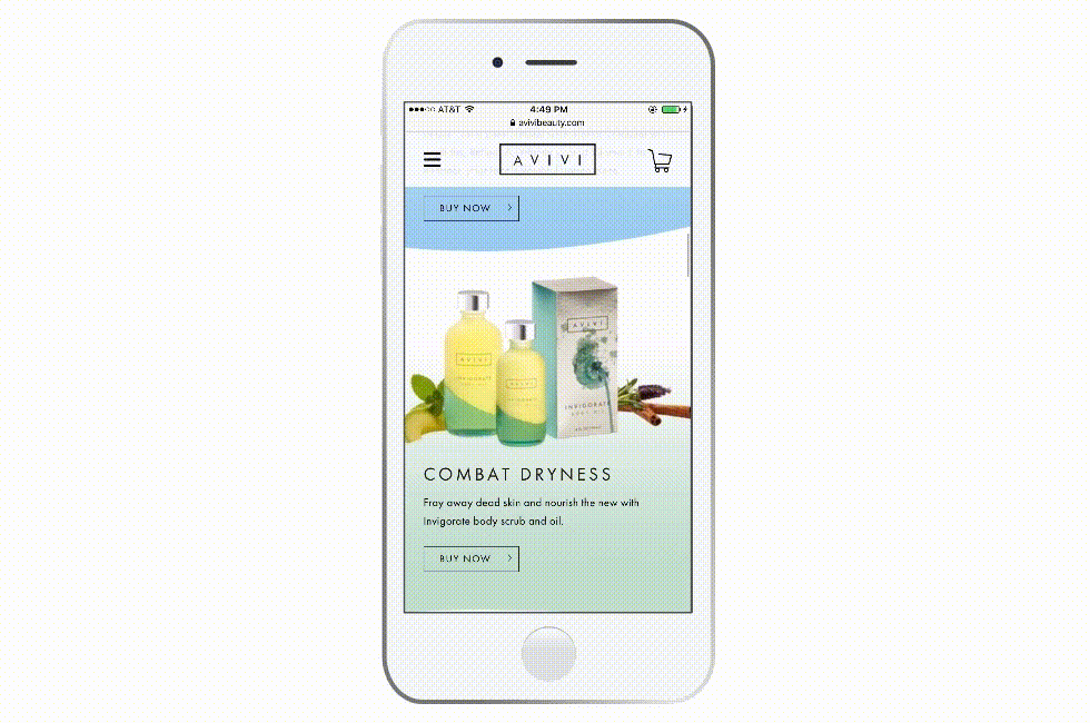 The final Avivi Site design features carefully art-directed model and ingredient photography to build an aura around the brand. Users can navigate by scent, product category or family, while learning about the benefits of cold-pressed avocado oil via authority building articles, reviews, and ingredient features. Individual product pages emphasize ingredients and benefits over hard-sell tactics.