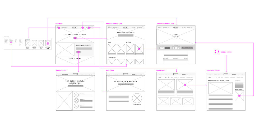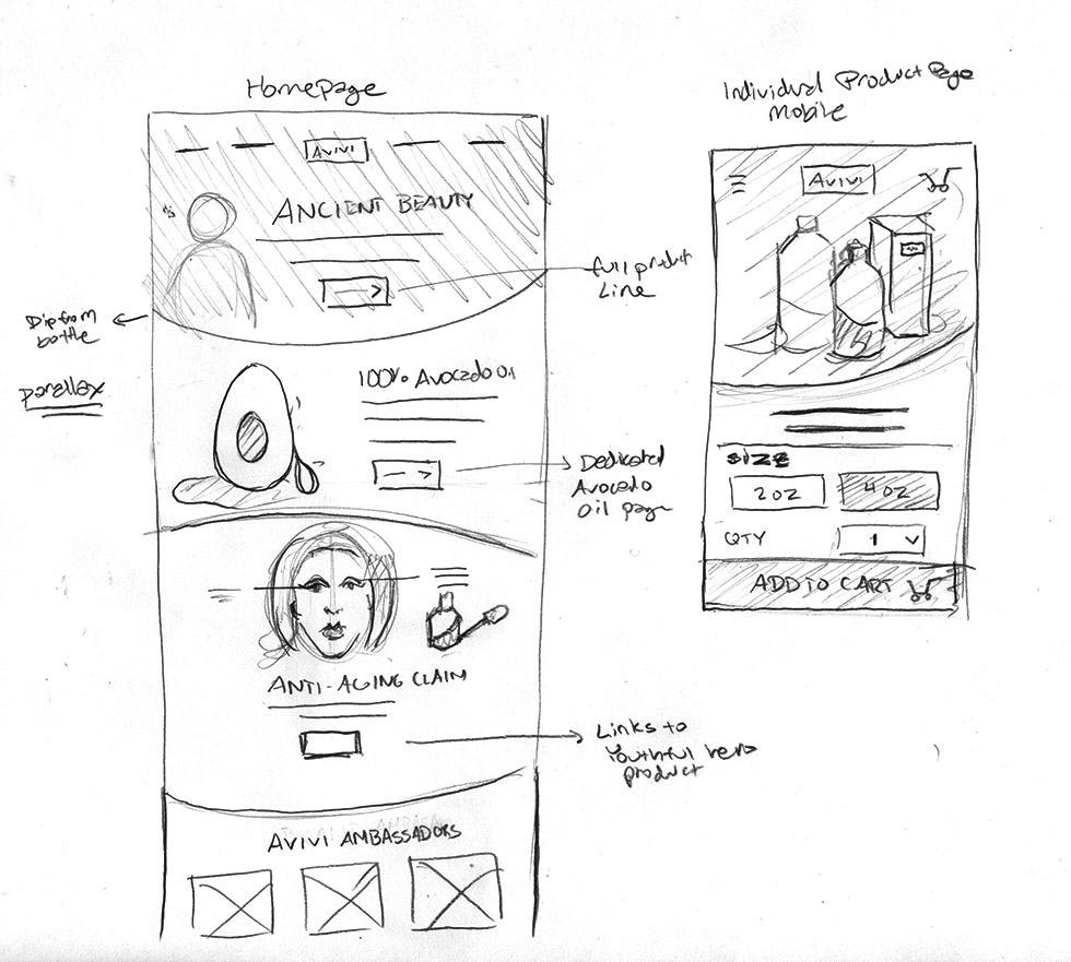 Having approached us while products were still in formulation, we had the opportunity to use design to inform product development, which would affect everything from brand positioning to the user experience on the brand-site and micro-site. Through stakeholder interviews and competitive research, we uncovered that no other brand had a robust offering leveraging the hydrating properties of cold-pressed avocado oil. We recommended that all products have avocado oil in them, and this inspired the name “Avivi.” In establishing baseline criteria for the websites, we determined that both sites needed to balance romance, product education and ingredients while being conversion-centric.