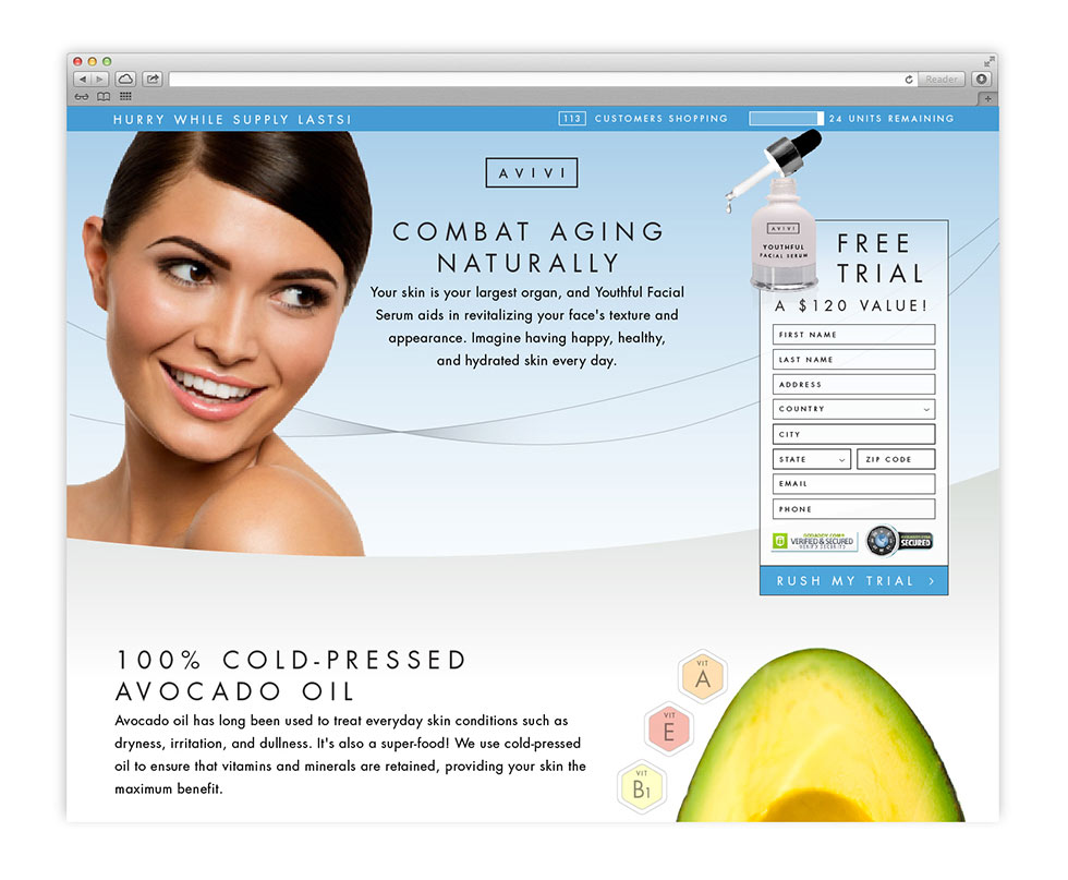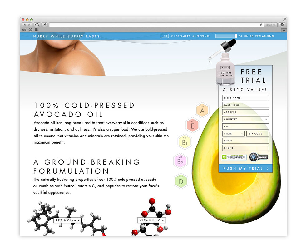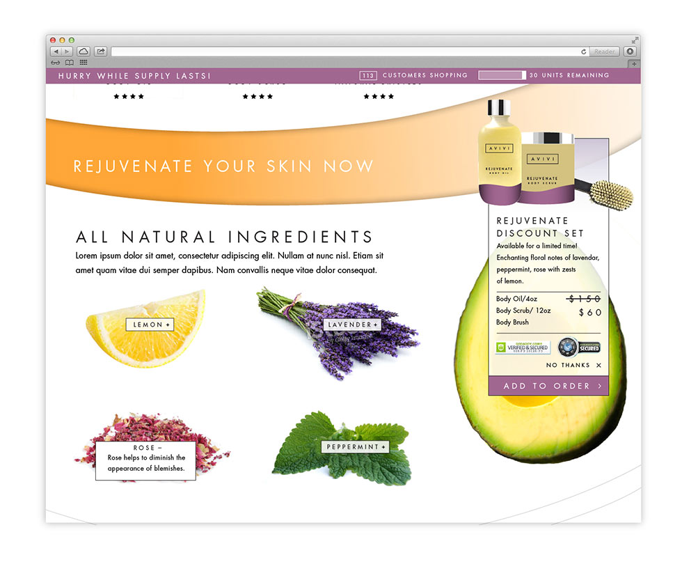The microsite uses the same visual design cues as the brand site—gentle curves lead the eye towards the action box, which initially contains a form. On subsequent pages, this becomes an add-to-order cross-sell. In addition the microsite employs other tactics including a scarcity module and real-time shopper number.