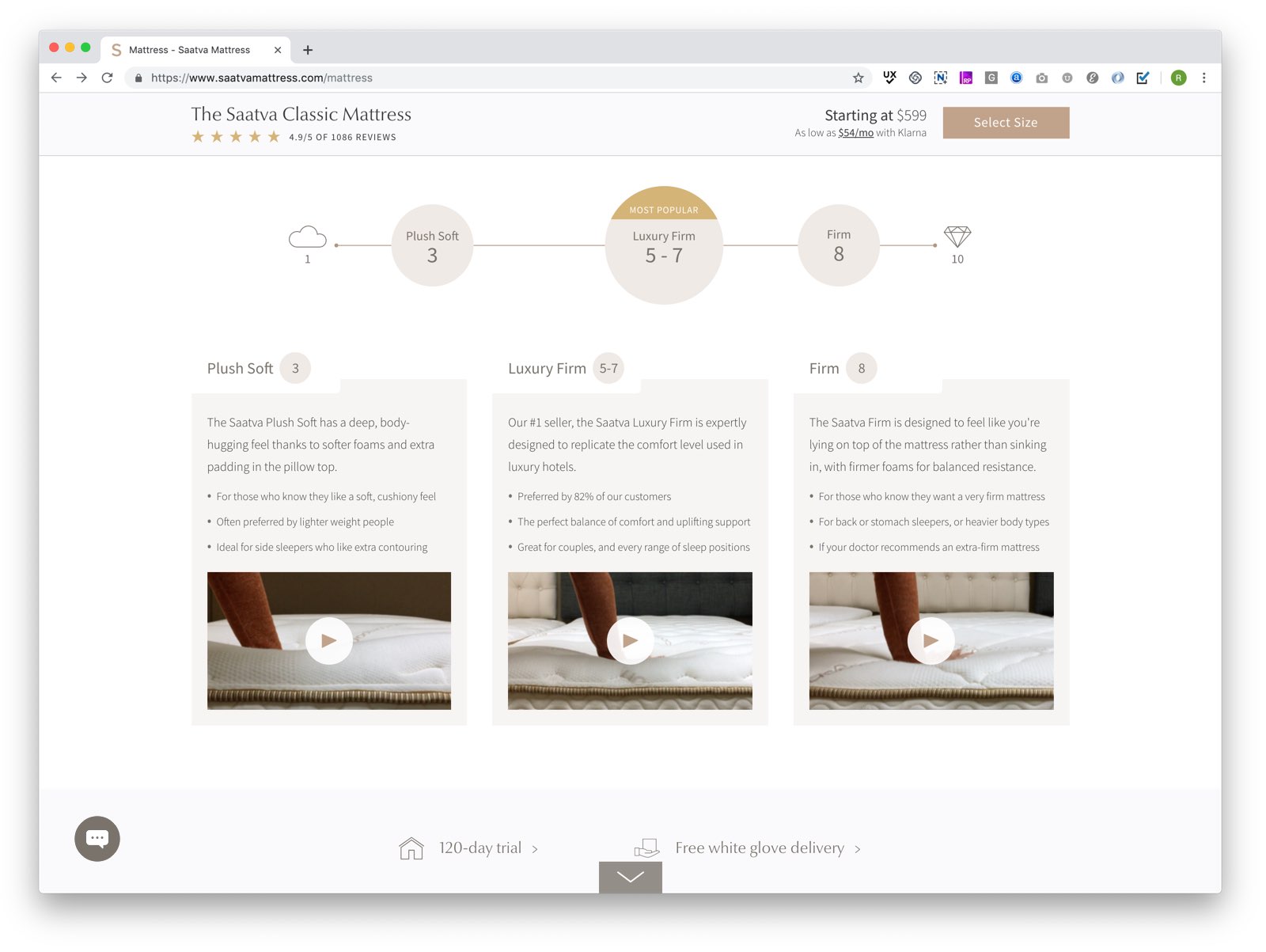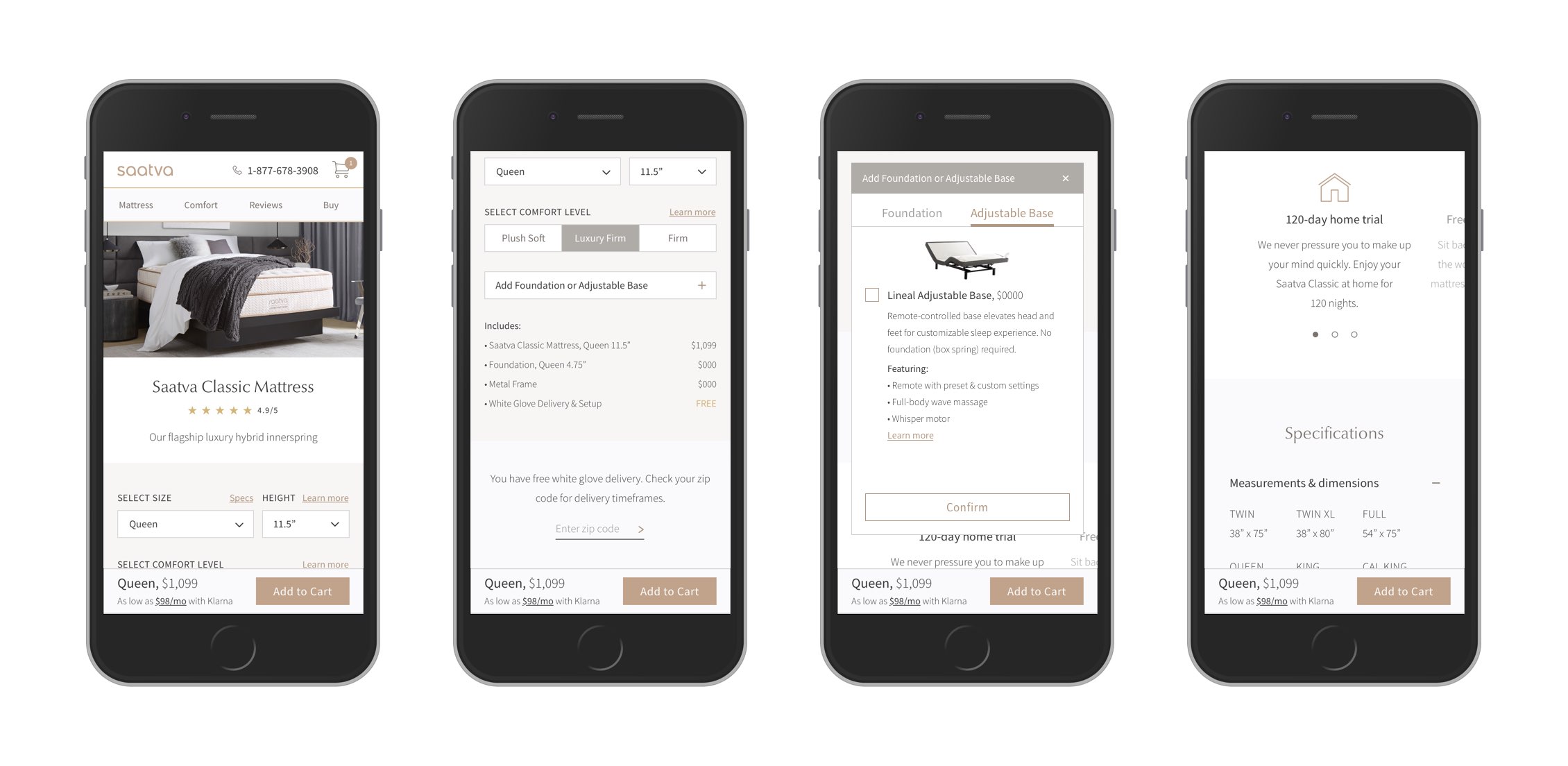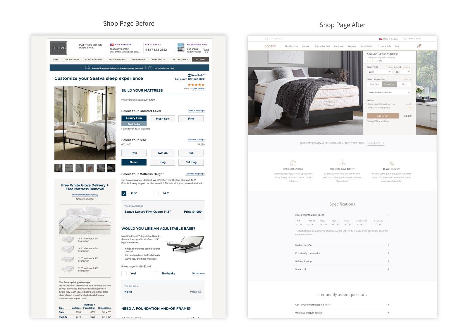 Final Design: Shop Page For the new shop page, we streamlined the mattress customization proces and used new react components that we would could leverage across other products.The page also includes lower funnel service story content, such as descriptions of Saatva’s free white glove delivery and 120-day home trail for added validation.