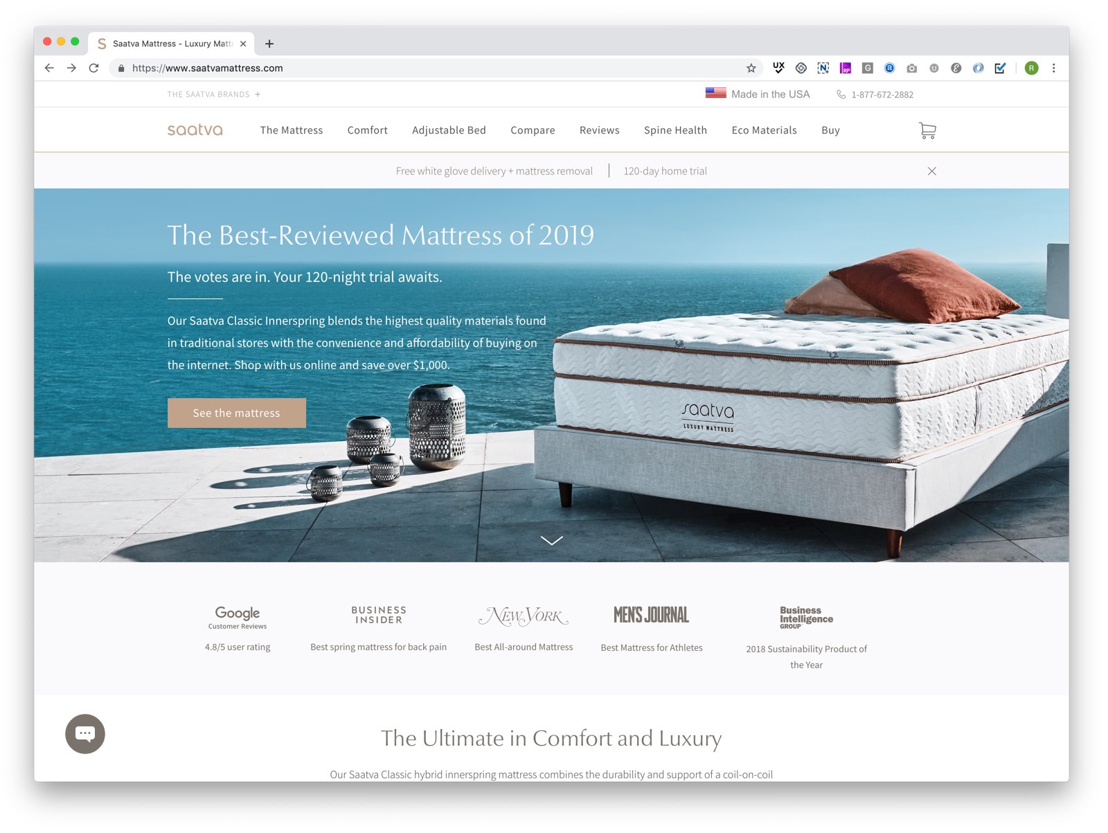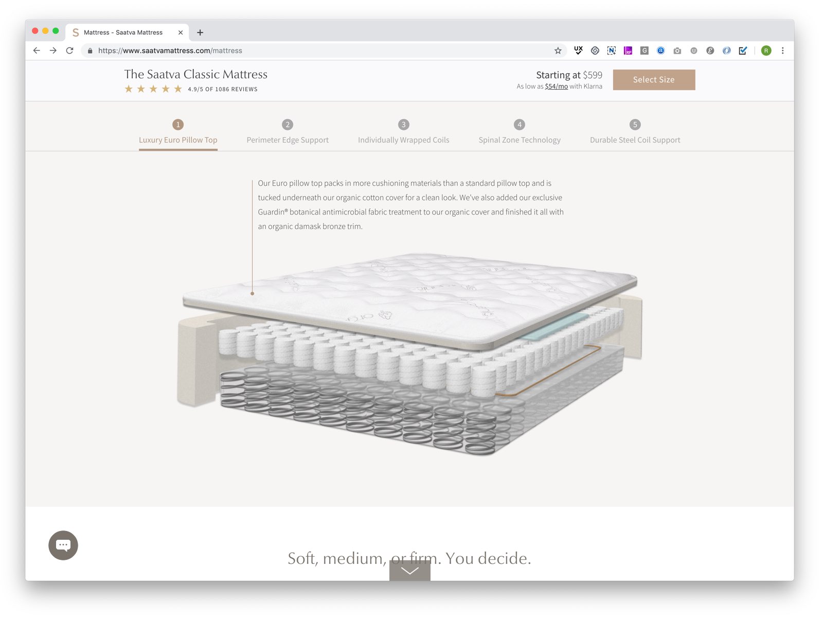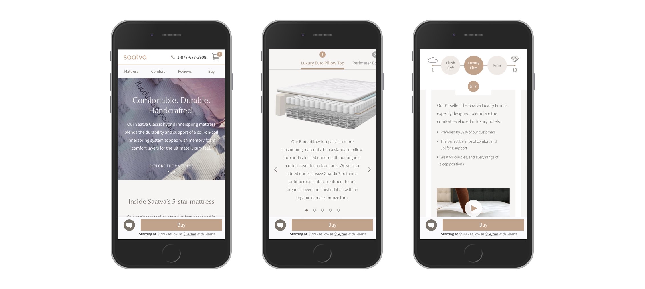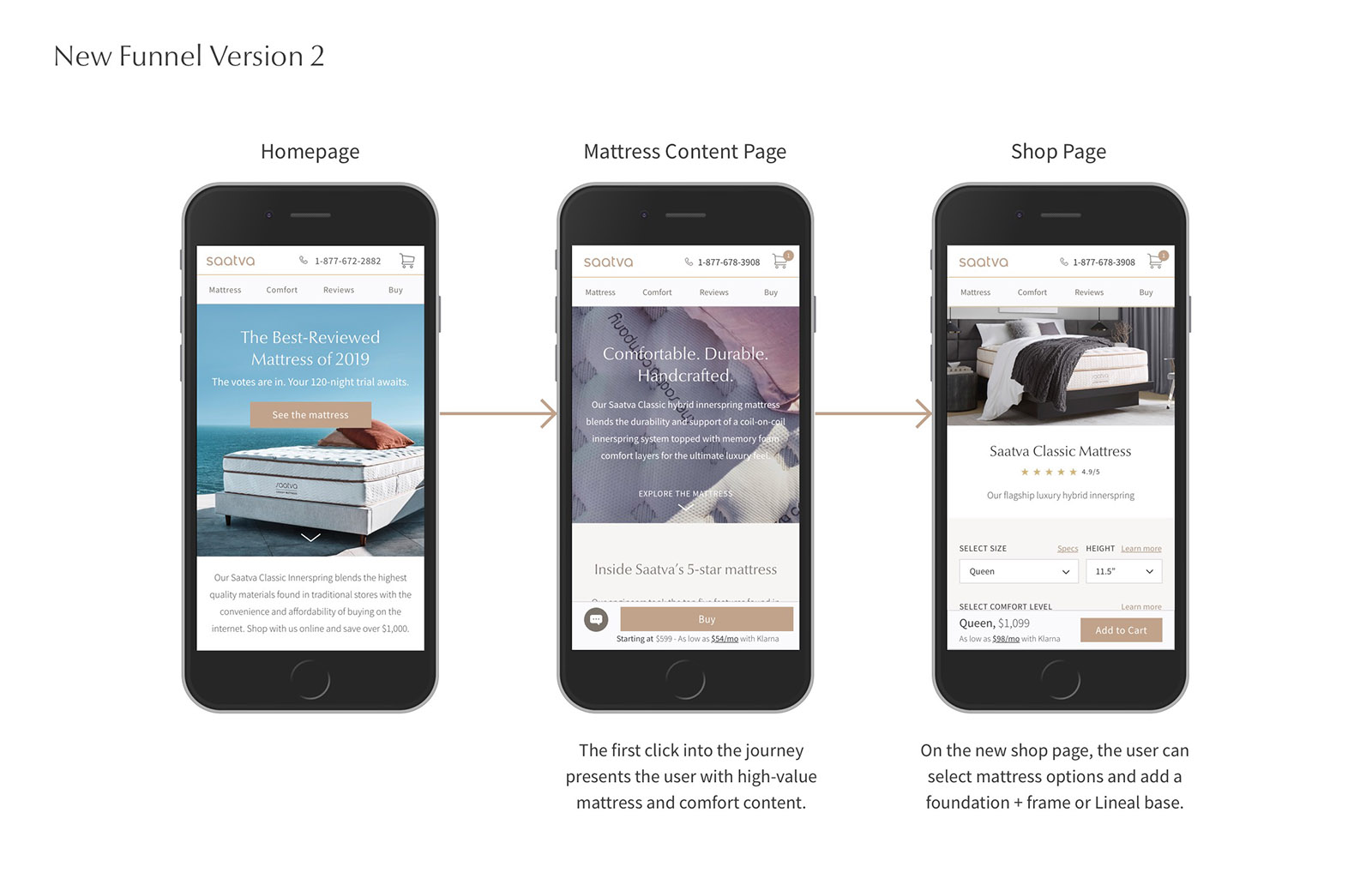 Saatva is America’s best-reviewed luxury sleep brand. In 2010 they disrupted the industry by becoming the first brand to sell a mattress exclusively online. By 2017 they had reached over 180 million in sales. With rapid growth focused on new product launches, Saatva’s core site experience had fallen behind. I led the UX team to transform the site into a more interactive, conversion-centric experience. The team went through several iterations, usability tests and a/b tests to reach a new site paradigm.