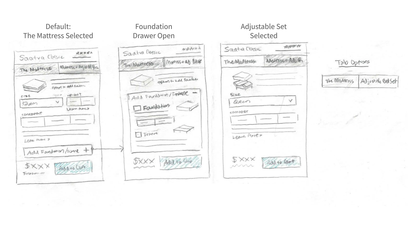 Product Panel Iteration Since the mattress product panel design pattern would be repeated across other products, we needed to take the time to get it right. Now that we were back to one shop page, we still wanted to find a way to cater to the needs of both standard and adjustable users. We wanted to understand if adjustability is a top-level decision or an addition that occurs after customizing the mattress. We created two different product panel prototypes for a comparative user test in order to get answers quickly. Sketches for Option 1 User selects the mattress, comfort level and then decides to add a foundation or adjustable base.