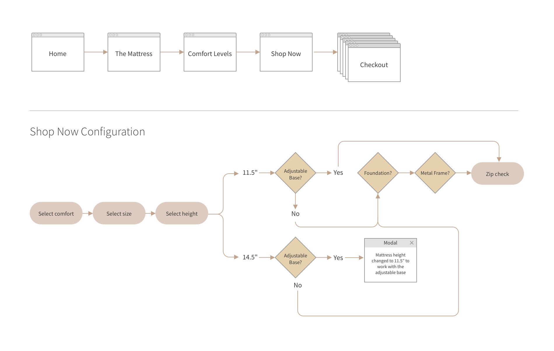 User Flow Take 2 After our sketching session we decided to go back to the single shop page, but combined the two previous content pages, mattress + comfort, into one. This move would solve some of the content discoverablity issues that occurred in the test by making extensive mattress and comfort information available one click into the journey. We also overhauled the shop page for a more streamlined configuration experience