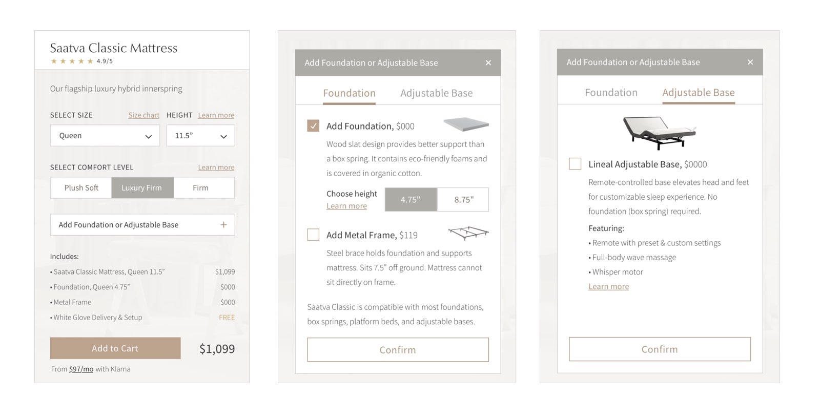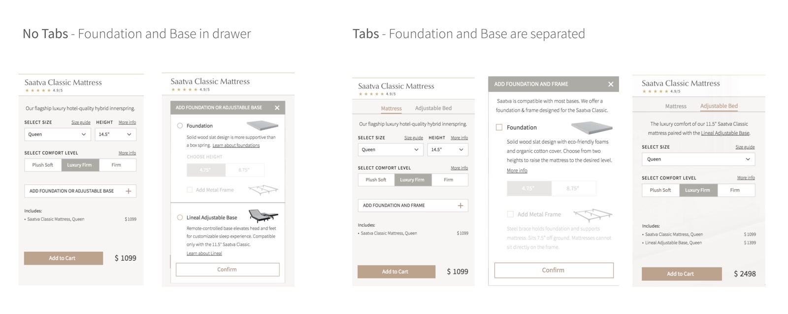 Product Panel Recommendation After discussing with the product managers, we came to a consensus that both the foundation and adjustable base are secondary add-ons, and that having tabs at the top level was distracting. However, we did acknowledge that the tabs allowed for a clear binary choice and provided extra room for important information. We decided to merge the best of both designs and combined the foundation and adjustable base into a single tabbed drawer.