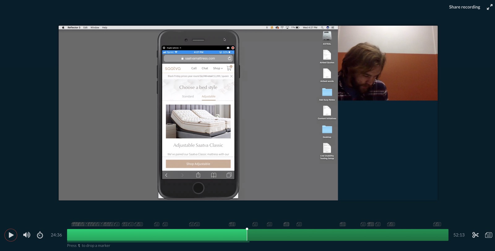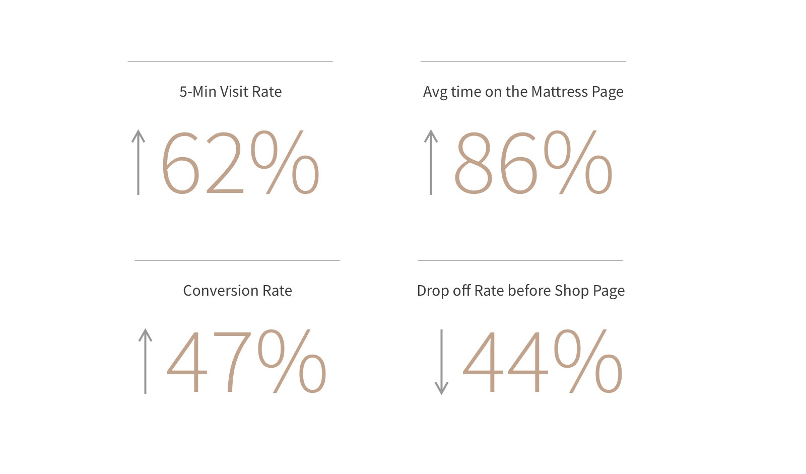User Testing the Prototype In order to test our hypothesis, we recruited 11 people for an in-person moderated test. Users were all currently shopping for a mattress online at our price point or above. Several themes emerged in the results: Most users were decisive in their bed style choice and thought it was easy to make selections and add to cart. They also responded positively to the overall design and imagery. However, most desktop users did not scroll on either of the shop pages, so they were missing out on key content that would have informed their purchase. Most users were also confused by the term bed style, and were wanting more information about comfort, materials, and delivery before making their selections.