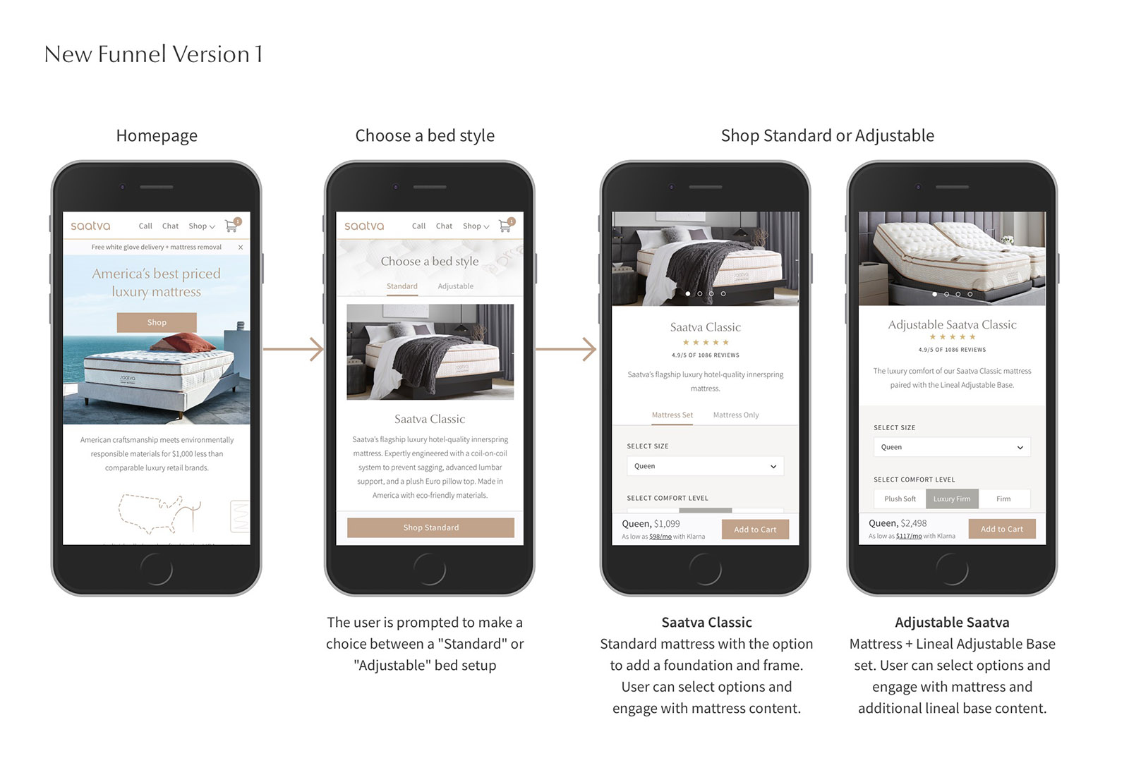 From our interviews with past customers, we determined that the needs of the adjustable base customer were different from those getting a mattress with a foundation. We decided to prototype a new shopping funnel where this difference was the primary choice one step into the journey. Users are prompted to choose a bed style, either “Standard” or “Adjustable,” which directs to two separate shop pages that have configuration and content. Our hypothesis was that users would spend the majority of their time on these shopping pages.