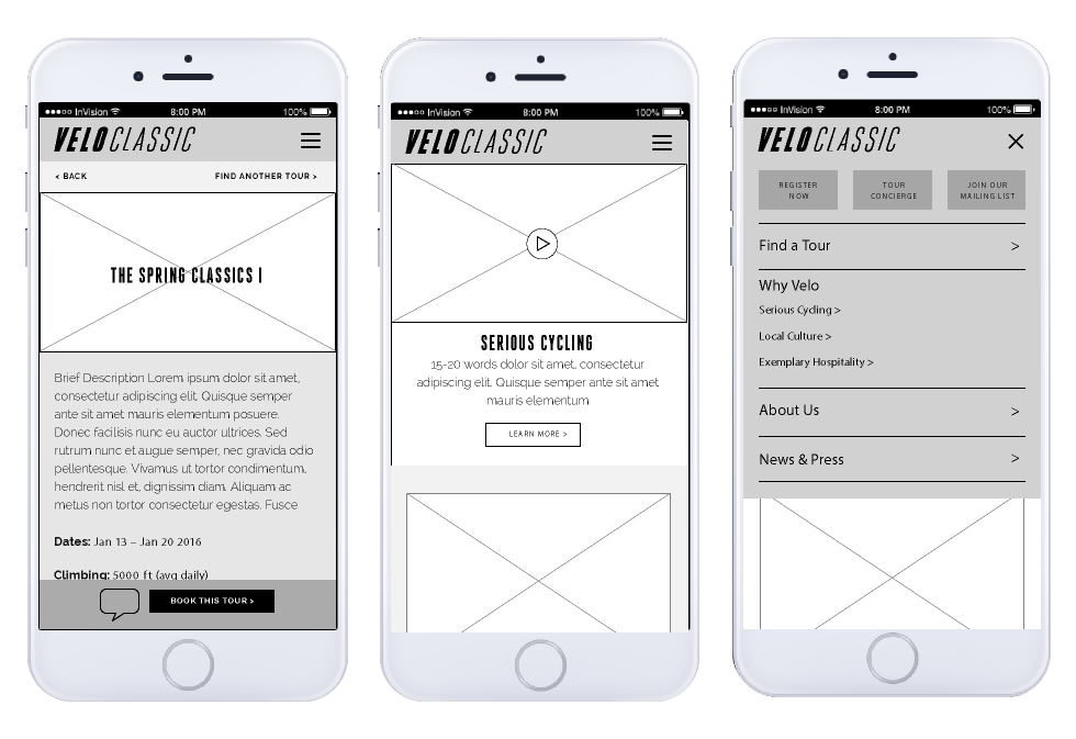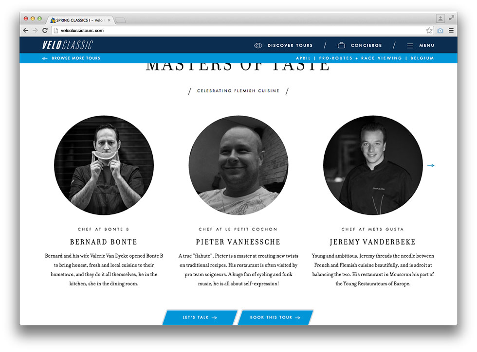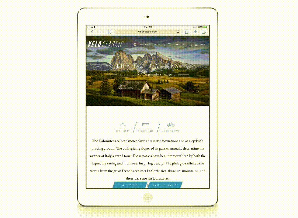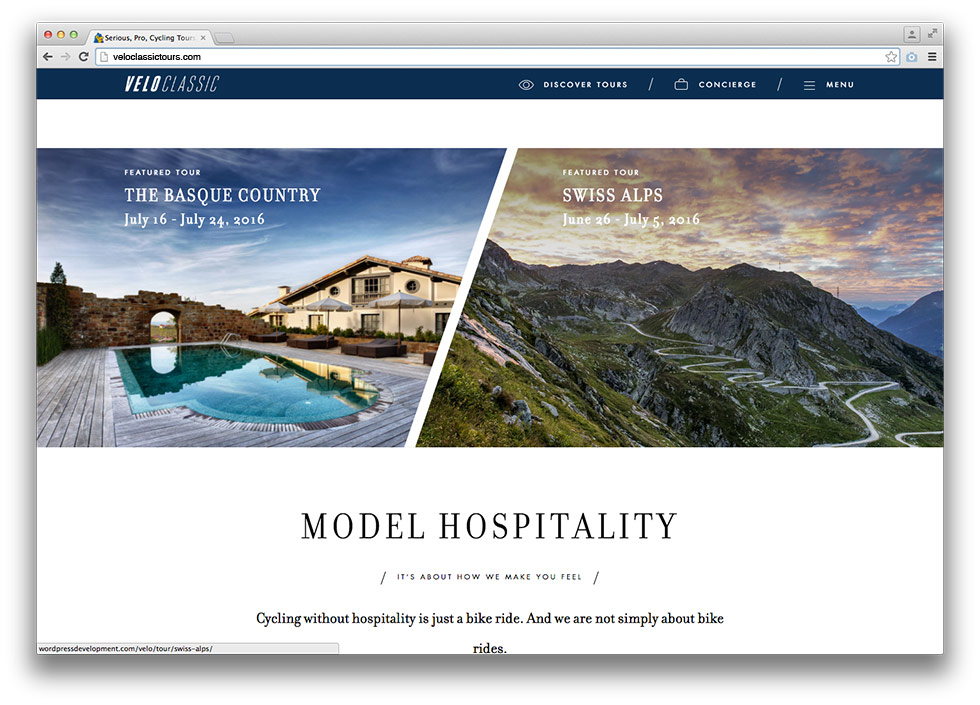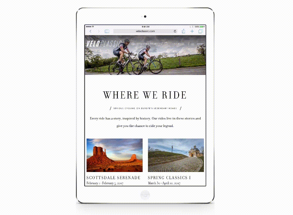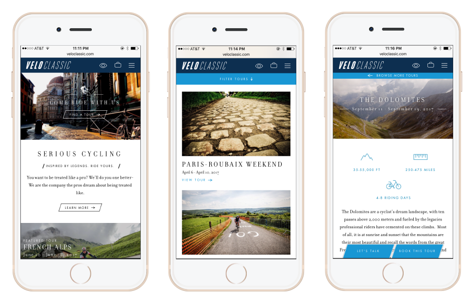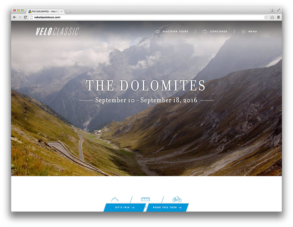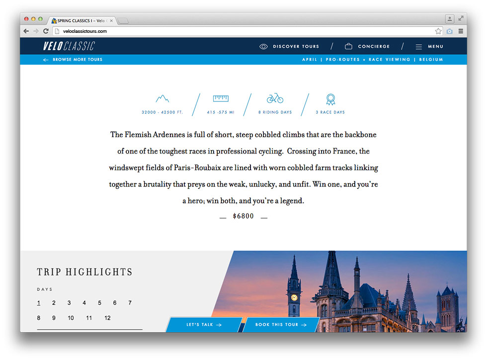 Luxury European cycling tour company Velo classic needed to evolve their existing website to make the process of booking trips faster, while reestablishing their unique luxury and pro positioning in the cycling tour market.
