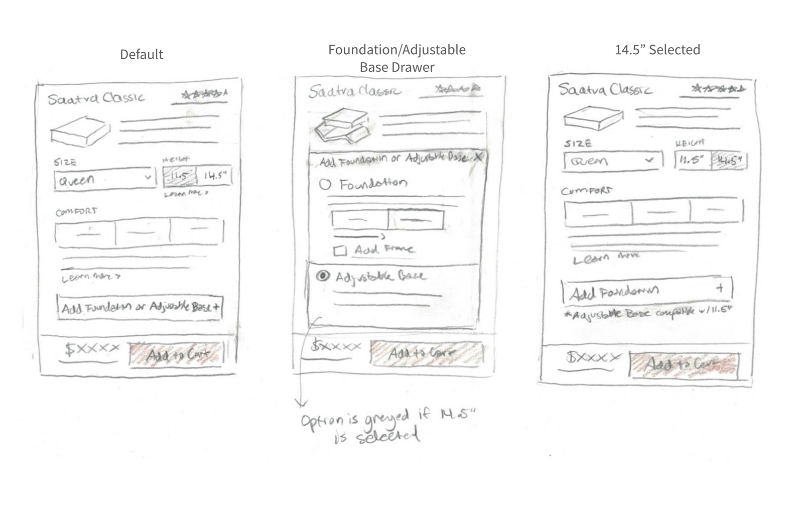 Product Panel Iteration Since the mattress product panel design pattern would be repeated across other products, we needed to take the time to get it right. Now that we were back to one shop page, we still wanted to find a way to cater to the needs of both standard and adjustable users. We wanted to understand if adjustability is a top-level decision or an addition that occurs after customizing the mattress. We created two different product panel prototypes for a comparative user test in order to get answers quickly. Sketches for Option 1 User selects the mattress, comfort level and then decides to add a foundation or adjustable base.